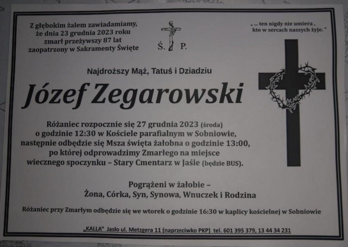Msza pogrzebowa odbędzie się 27.12.2023 o godz, 13:00 w Kościele parafialnym w Sobniowie.