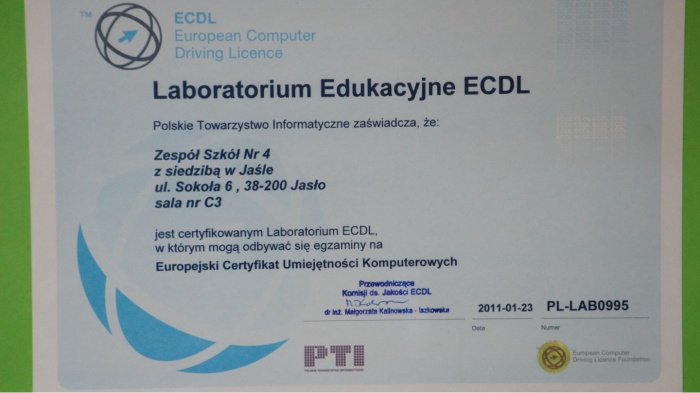 Certyfikowane Labolatorium ECDL w pracowni komputerowej C3 przy Zespole Szkół nr 4 w Jaśle, ul. Sokoła 6, 38-200 Jasło