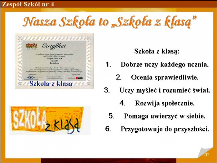 „Szkoła z klasą" - celem tej akcji jest realizowanie zadań przygotowanych przez organizatorów: jaka jest nasza szkoła, jak uczymy się współpracy, jak twórczo i krytycznie myśleć, jak zrozumieć świat i lepiej w nim sobie radzić, jak przygotować się do życia w nowoczesnym świecie, nauczyć się języków obcych, obsługi komputera i Internetu.