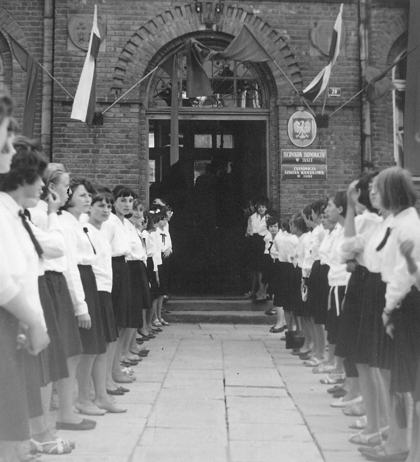 Szkoła – żywa tkanka, tym razem złożona z młodzieży. Tylko kilku chłopców, reszta dziewczęta w ogromnej większości z rodzin chłopskich, robotniczo-chłopskich i robotniczych, w znikomym procencie z rodzin inteligenckich. Młodzież, jak dziś ją pamiętam, przyjazna wobec siebie, chętna, właściwie ucząca się dobrze, bardzo zdyscyplinowana i „ułożona z domu”, a rozumiem przez to postawę i zachowanie. Młodzież ciekawa wiedzy i na swój sposób pilna w jej przyswajaniu. Młodzież żywa w zachowaniu, ale nie łobuzerska, no i jeszcze w białej bluzeczce, granatowej spódniczce „od święta”, a fartuszku z białym kołnierzykiem „na co dzień” i tarczą szkolną na rękawie płaszcza lub kurtki. Śmiem dziś stwierdzić, że młodzież Technikum Ekonomicznego wyróżniała się w środowisku szkolnym Jasła bardzo korzystnym zachowaniem. „Przedszkolanki” były w tym zakresie niedościgłe: umundurowane, parami, zmierzały do budynku dwoma kolumnami z internatów przy ul. Staszica i Śniadeckich, rano i wieczorem – cały dzień spędzały w szkole… Nasza młodzież za to gromadą szła od porannych pociągów „do miasta”, i potem, pomiędzy 14 a 15 na stację kolejową. Dworzec autobusowy był „pod szkołą” na pl. Żwirki i Wigury, a do MKS-u trzeba było dojść do Rynku lub ul. Basztowej i tych „pochodów” nie zauważało się tak wyraźnie.